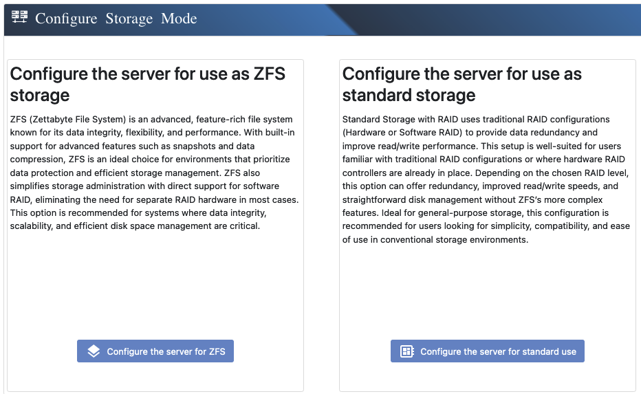 Standard Mode uses the XFS file system, known for its speed, efficiency, and scalability. It’s a better fit for environments using hardware RAID controllers or where low overhead and fast I/O are a priority.