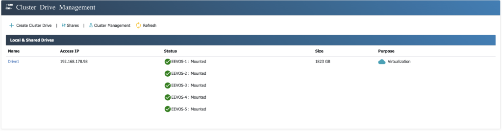 Unlike mirrored hosts or distributed storage systems like Ceph, shared storage uses external or central storage resources that allow all eEVOS hosts to access the same volumes concurrently, without the need for local data replication.