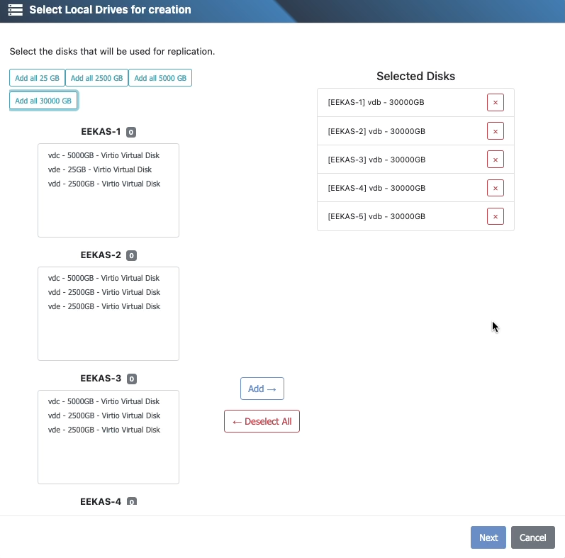- Make sure you have the same number of free disks on every node—eEKAS requires a balanced selection.