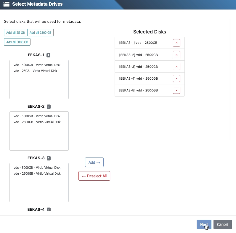 Erasure Coding: Selecting metadata disks is required. The wizard will move to the Metadata Disks page.