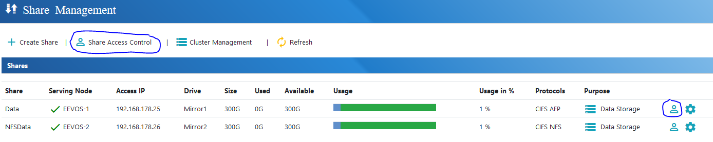 Every cluster drive is available through SMB and its dedicated IP Address. Following authentication types are permitted