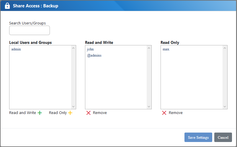 You can define access to the drive via “Data Management” – “Shares” – “Share Access Control” or click on the “User Icon” next to the share