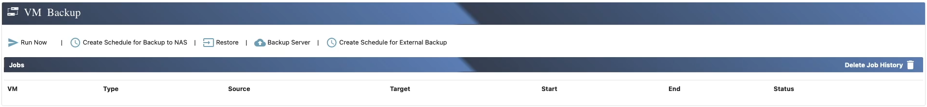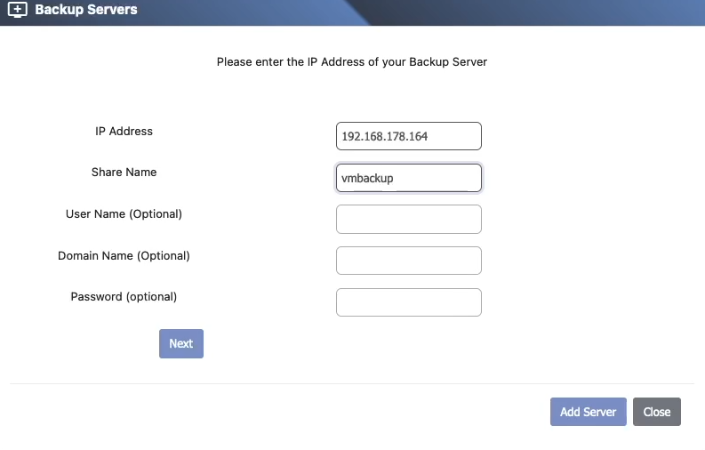 In the VM Backup Management, you can define a Backup Server, specifying the NAS destination where backups will be saved. Once configured, this Backup Server can be selected as a target when creating Network Backup Jobs, streamlining the backup process and ensuring efficient data protection.