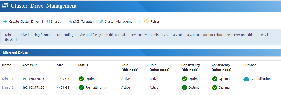 Once the drive is created, you will see it listed in the Cluster Drive Management interface.