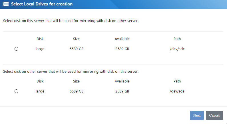 Choose the type of storage for your cluster drive. You can either create a drive mirror or a shared drive accessed by both nodes via iSCSI, SAS, Fibre Channel, NVMe-oF, or NVMe over TCP. In this example, we will create a drive mirror.