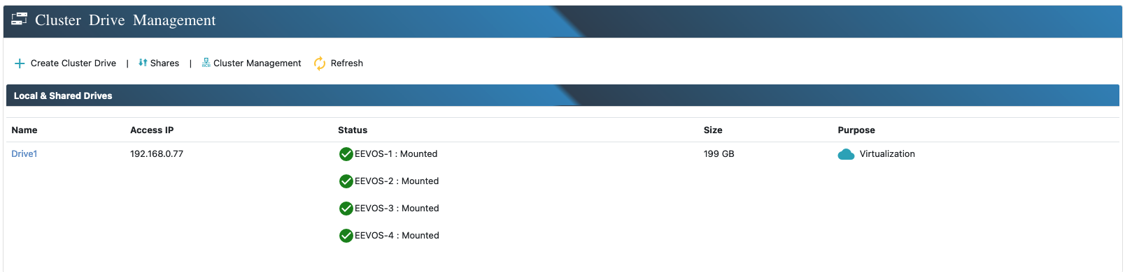 Once the drive is created, you will see it listed in the Cluster Drive Management interface. Now it is ready for use.