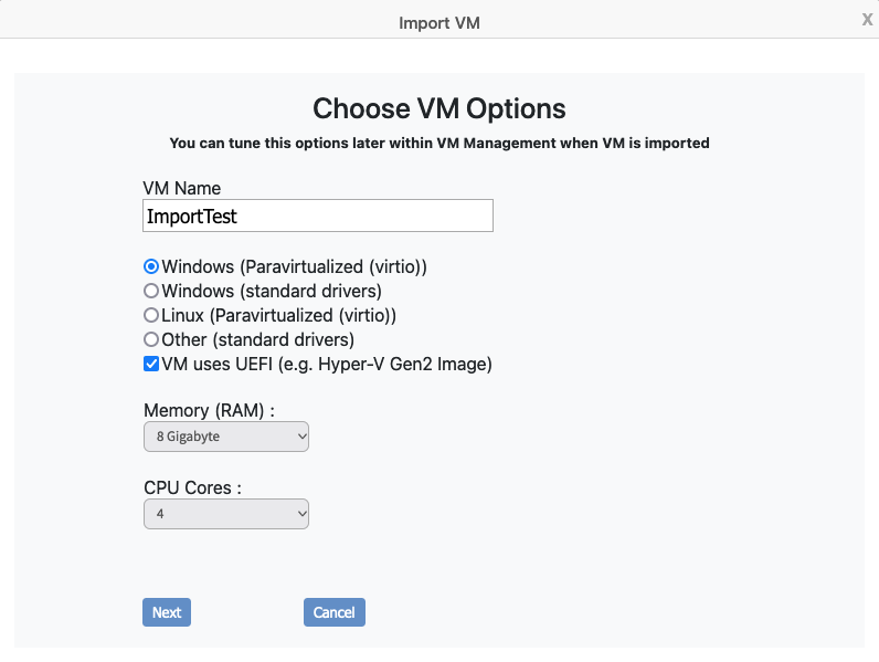 Choose the initial configuration options for your VM. These options can be fine-tuned later in the VM properties. Important: If your VM uses UEFI, make sure to enable the UEFI option here.