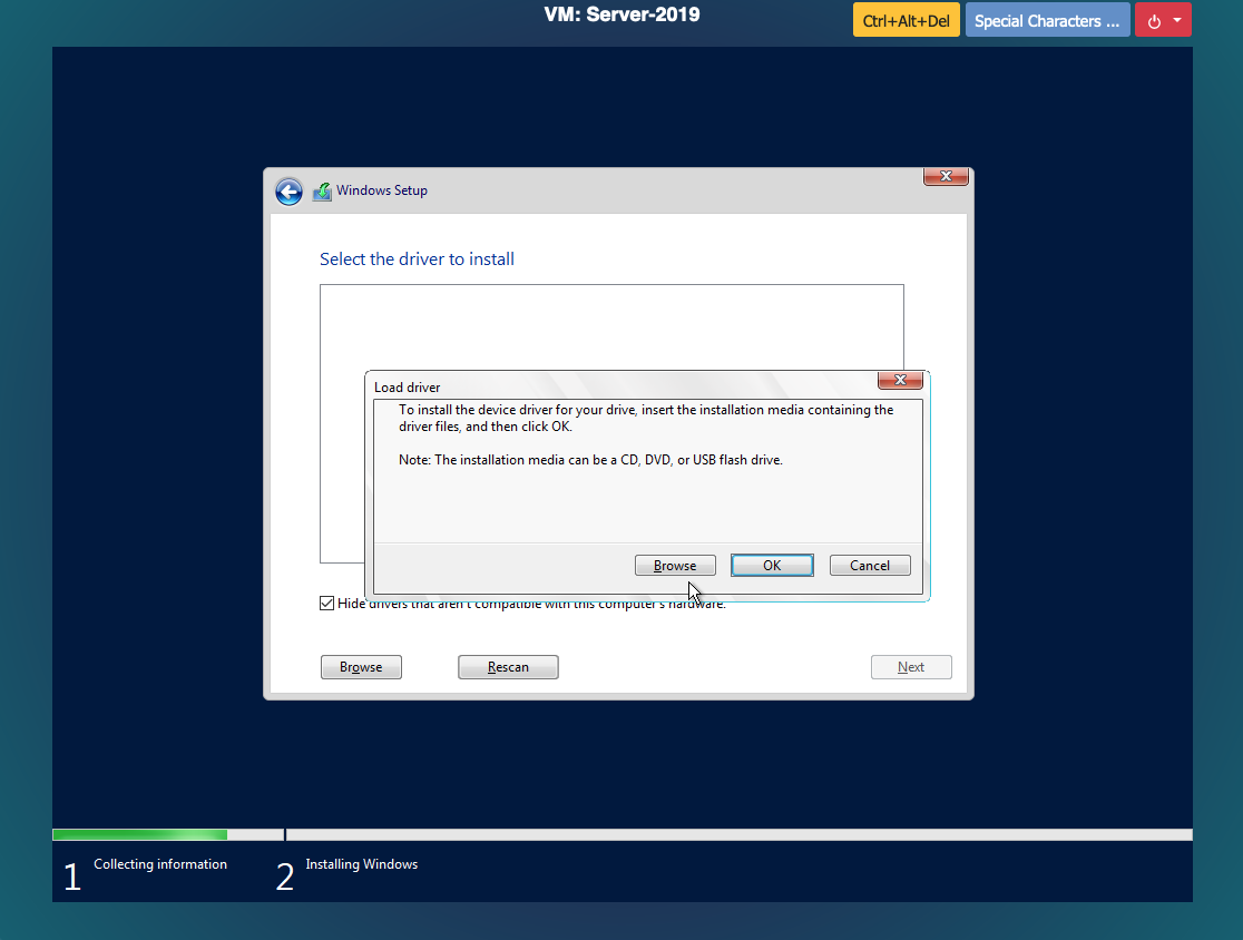 During the installation, Windows may report that no disk has been found because it does not have the required disk drivers. To resolve this, click on Load Driver to manually load the driver.