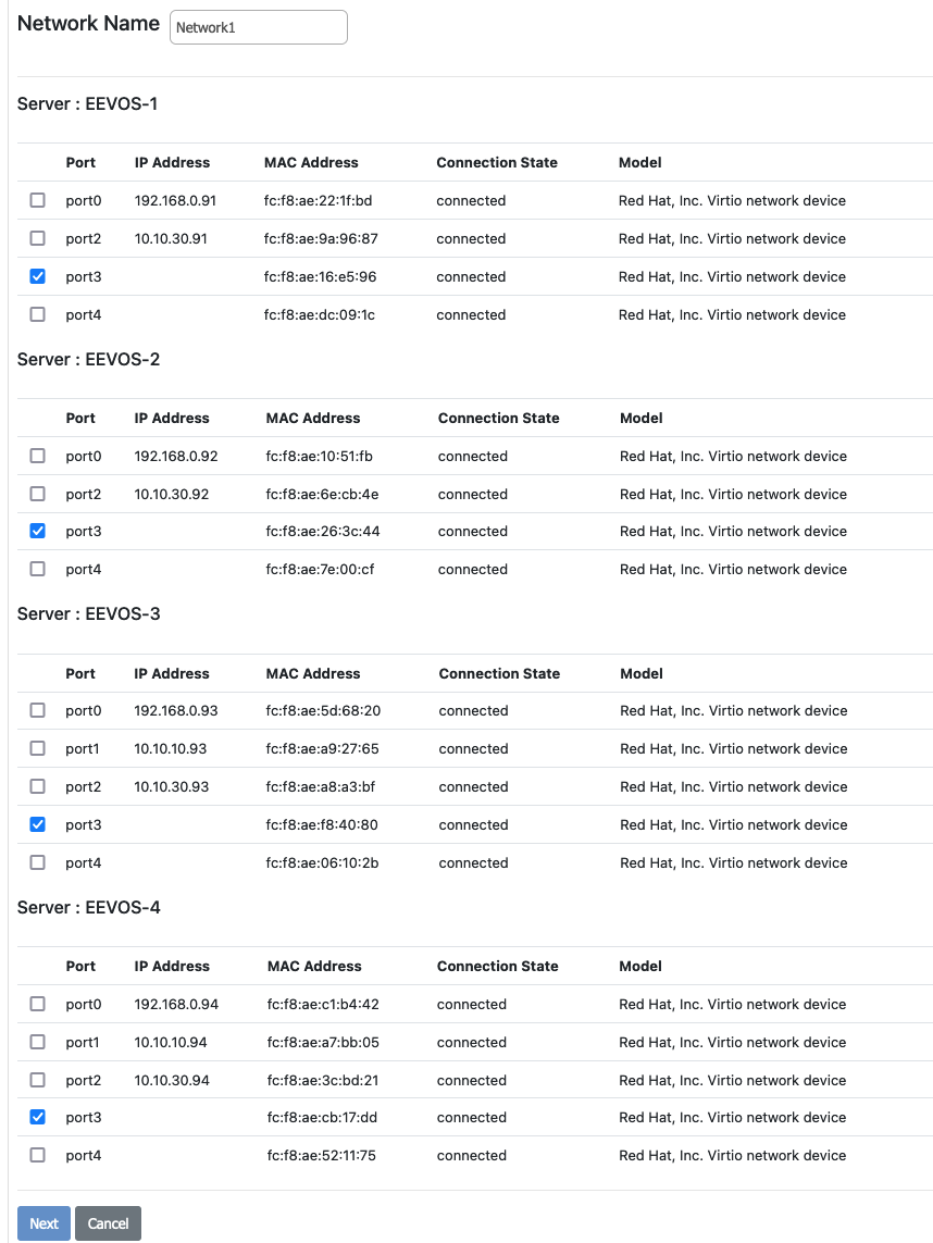 You will now select the individual network port on each node that will be used to bridge the Virtual Network to the external network. Only ports that are either set to static IP or not currently configured will be available for selection. This ensures that the selected port is dedicated to the Virtual Network, avoiding conflicts with other network services.