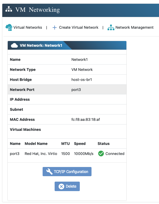 After selecting the network ports, the Virtual Network setup is complete. The newly created Virtual Network will now appear in the Virtual Networks overview. You can now assign this network to the virtual ports of your VMs, enabling them to communicate with other devices on the network.
