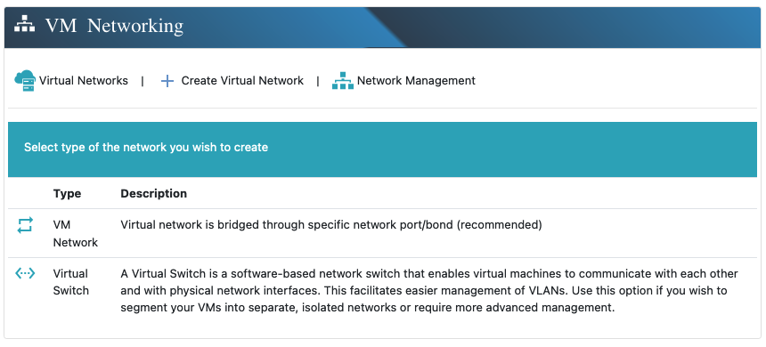 In the next step, you will be prompted to select the network type. Choose “Virtual Network” as it is the best choice when no complex VLAN configuration is necessary.