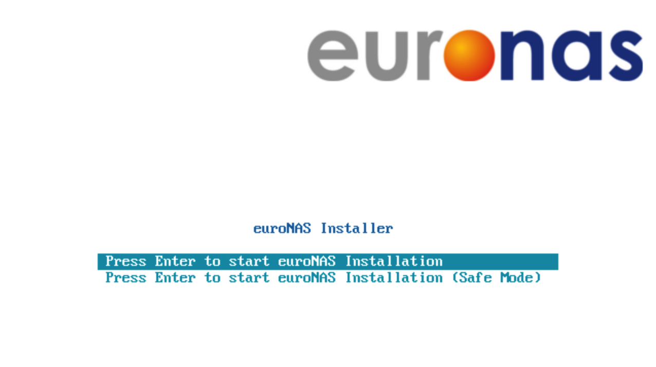 As outlined earlier, the euronas Premium Plus operating system is installed from a dedicated ISO image. When the system boots correctly from the ISO, you will be presented with the initial installation screen.