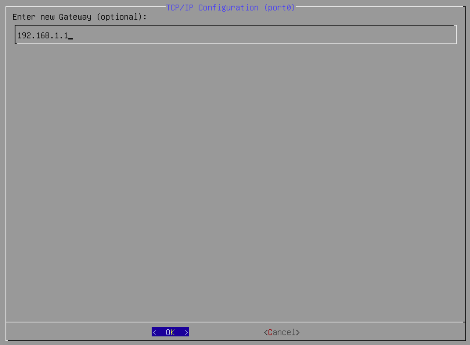 The final screen provides the option to configure the default gateway. In this example, the gateway is set to 192.168.1.1, which allows the system to communicate outside of the 192.168.1.0/24 subnet.
