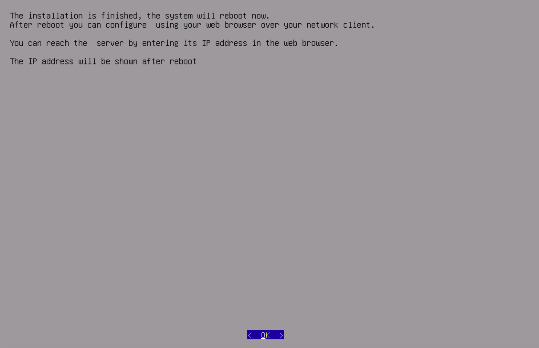 The base installation is now complete. Ensure the ISO image is no longer mounted and that the server is configured to boot from the system disk. Failure to do so may result in the system repeatedly booting back into the installation process.