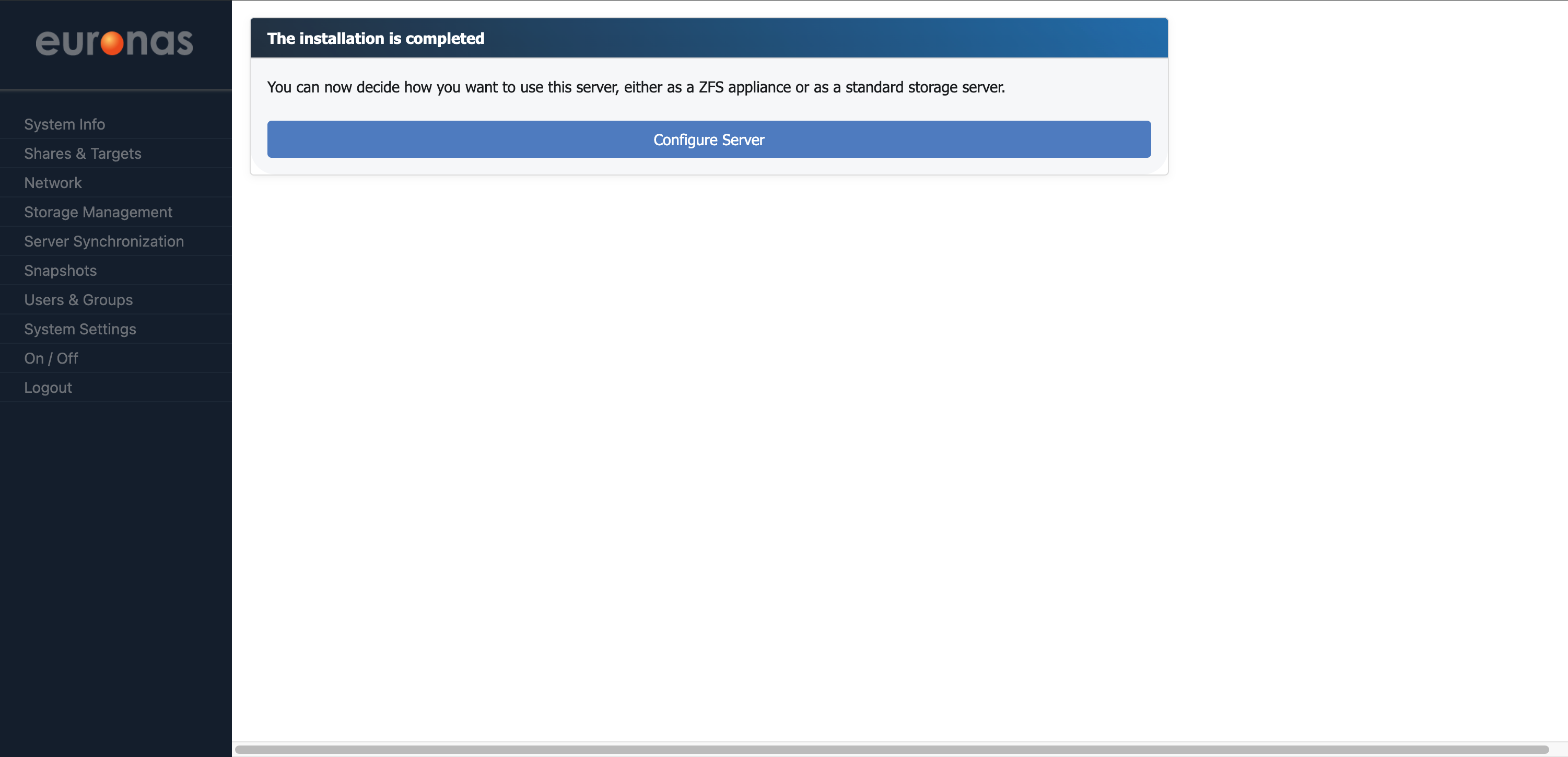 Once you have successfully logged in, you will be presented with the option to create your server instance and select the storage method to be used, either ZFS or XFS.Select Configure Server to proceed.