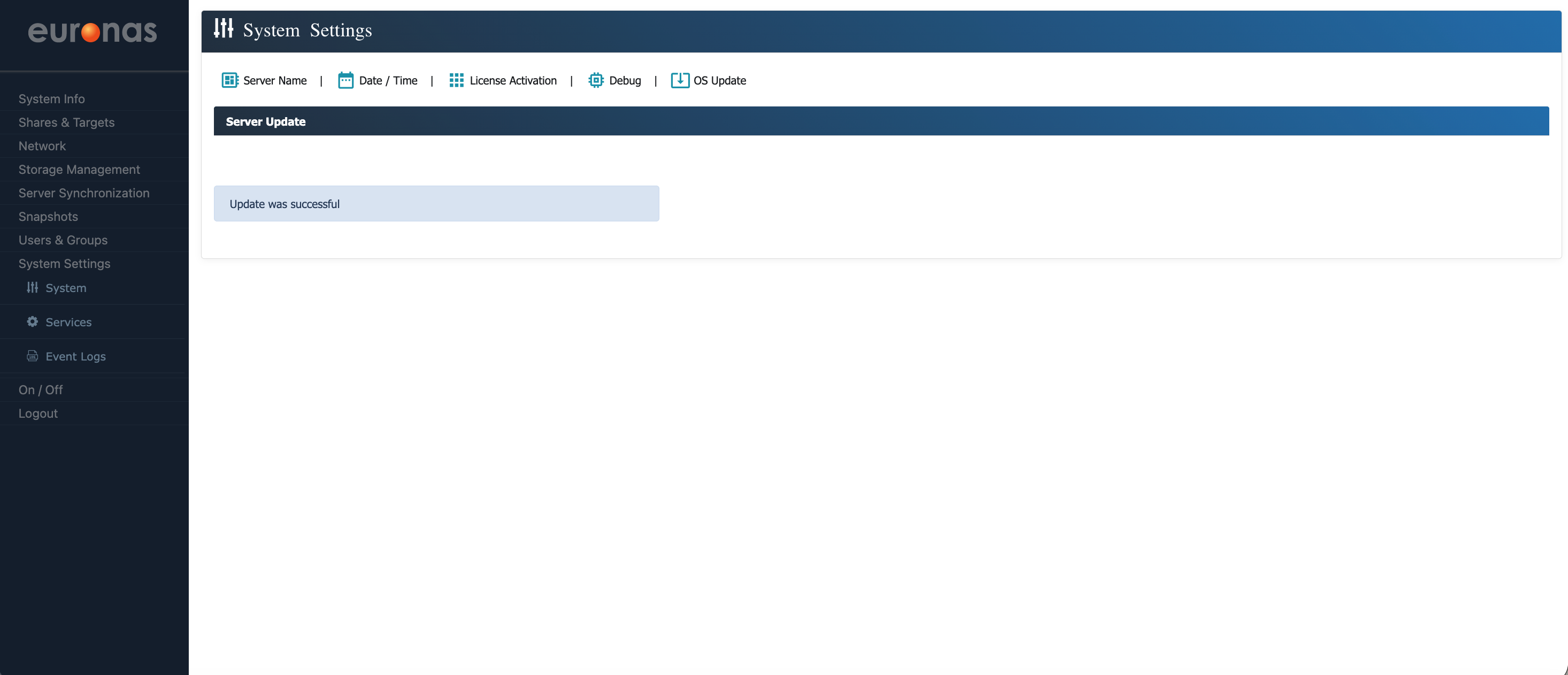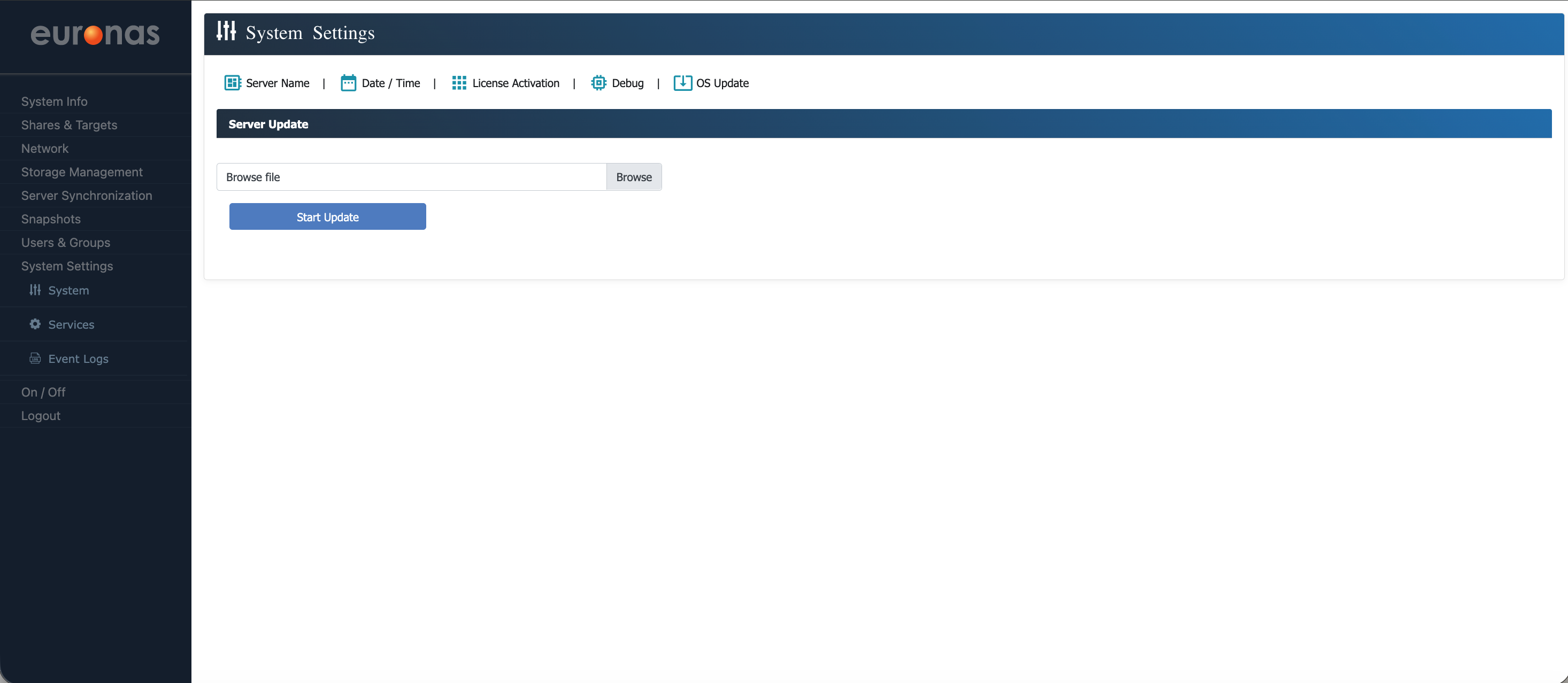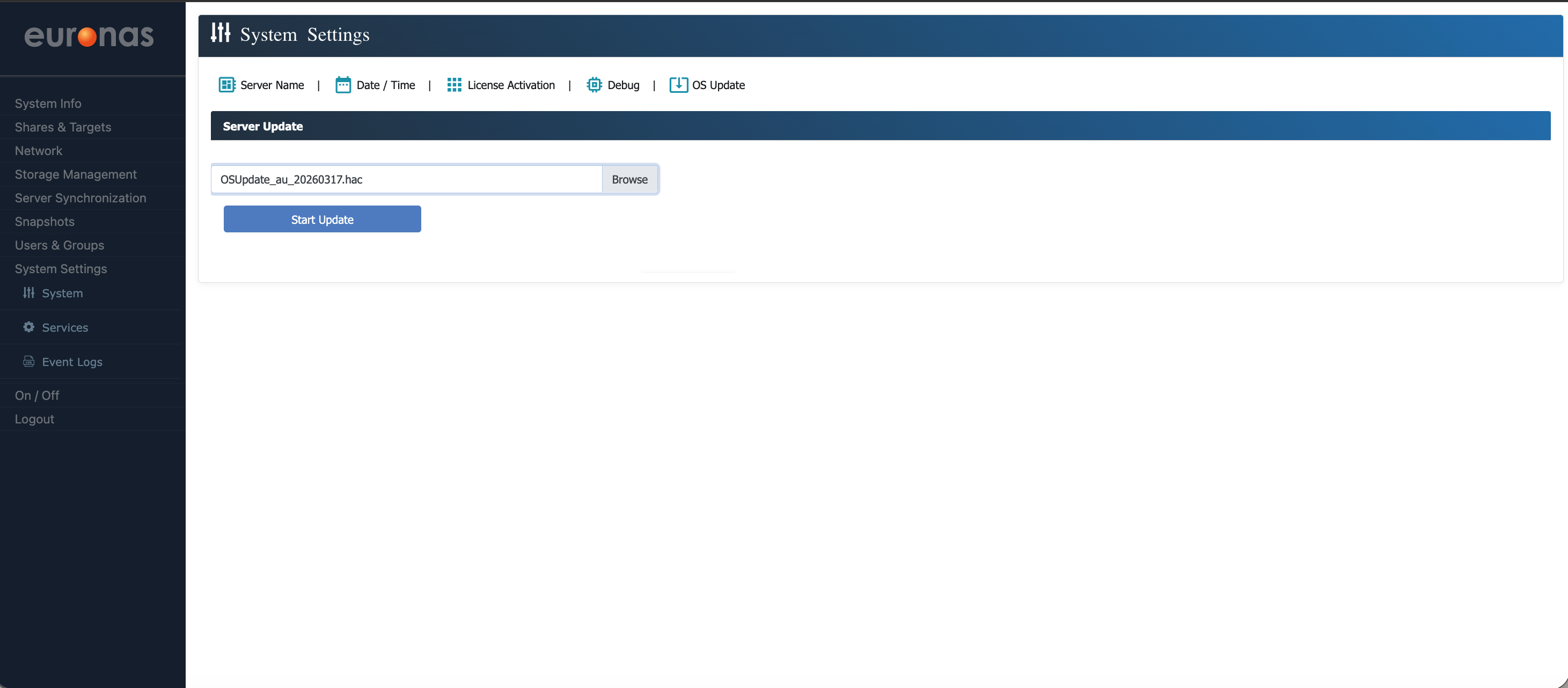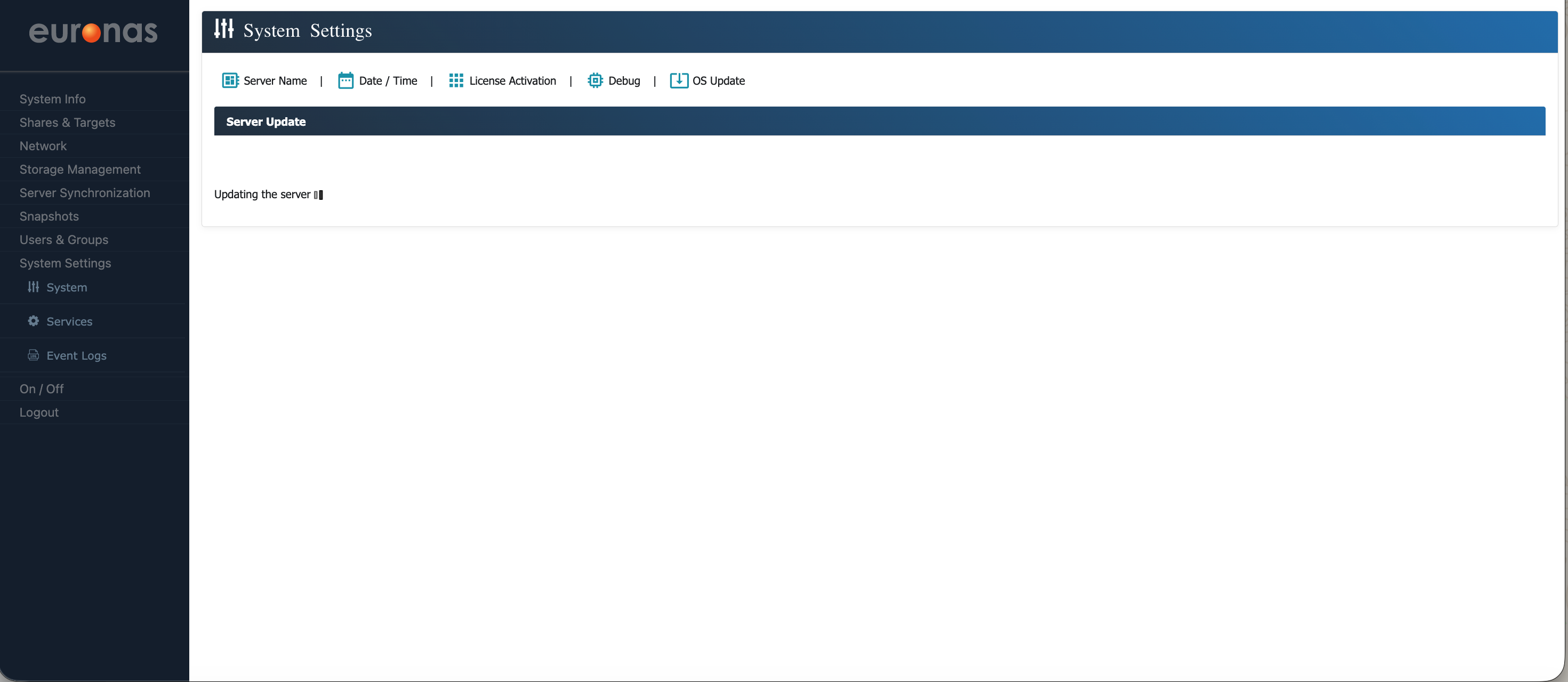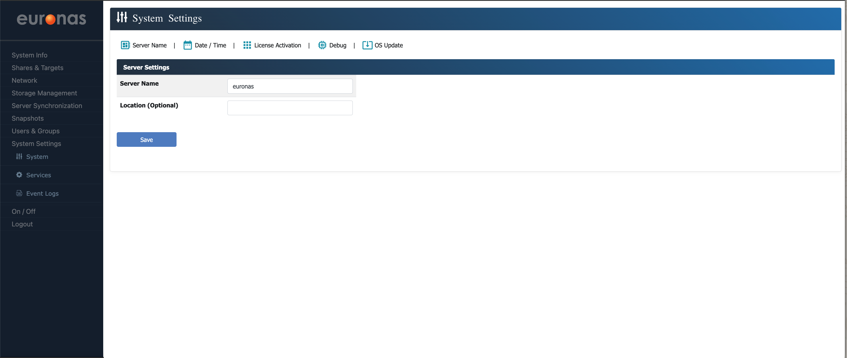 From the sidebar under System Settings, select the System icon to open the configuration page. Here, you can update the server name and location if required. Once any changes have been made, select Save to apply them. The system will update these settings in real time without the need for a reboot. Select the OS Update icon to open the Server Code upgrade wizard.