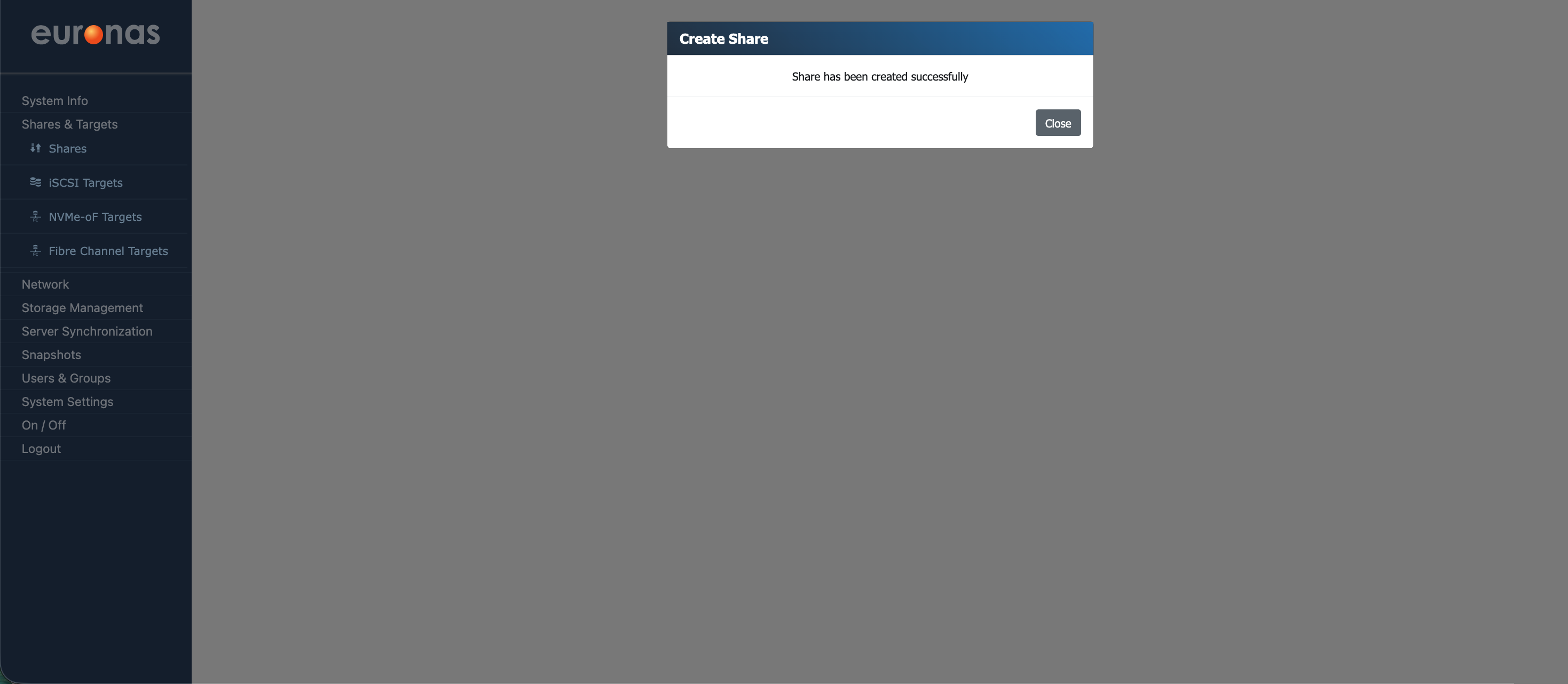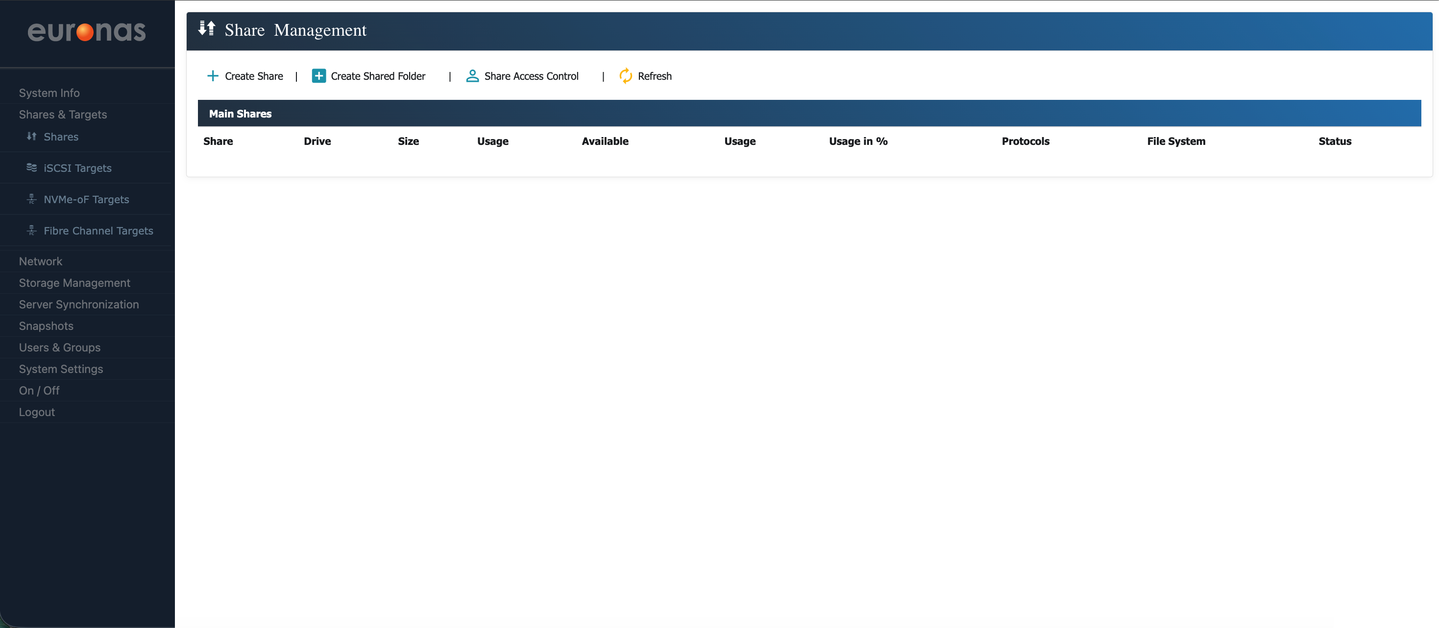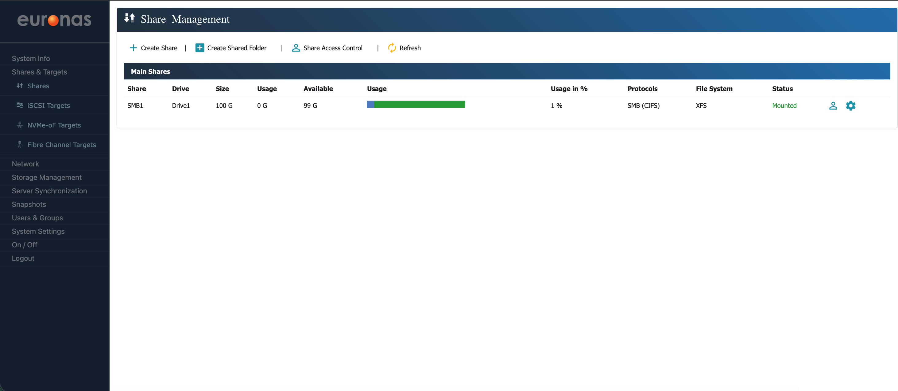 This will open the Share Management screen, where file-based access is configured. From here, SMB and NFS shares can be created and managed, providing access to storage for client systems. Now go ahead and click the + Create Share option
