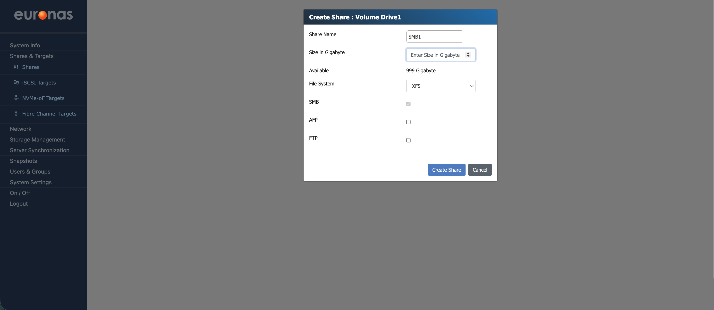 In this example, a size of 100 GB has been selected for this share from the available 1 TB drive.