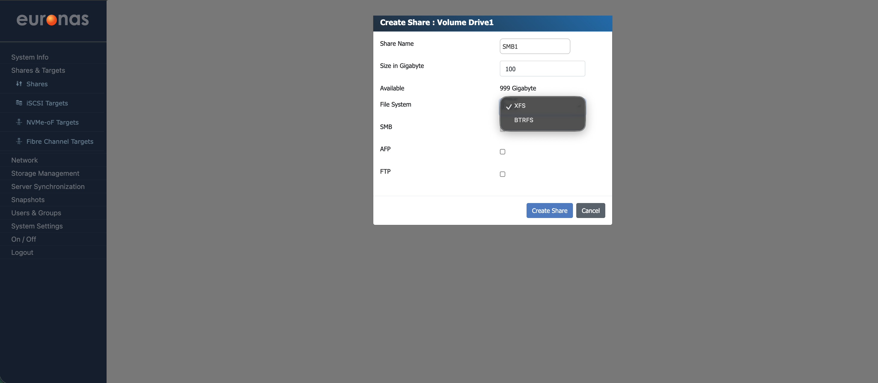 At this stage, select the file system for the share. This determines how data is written to disk and how the storage is handled.