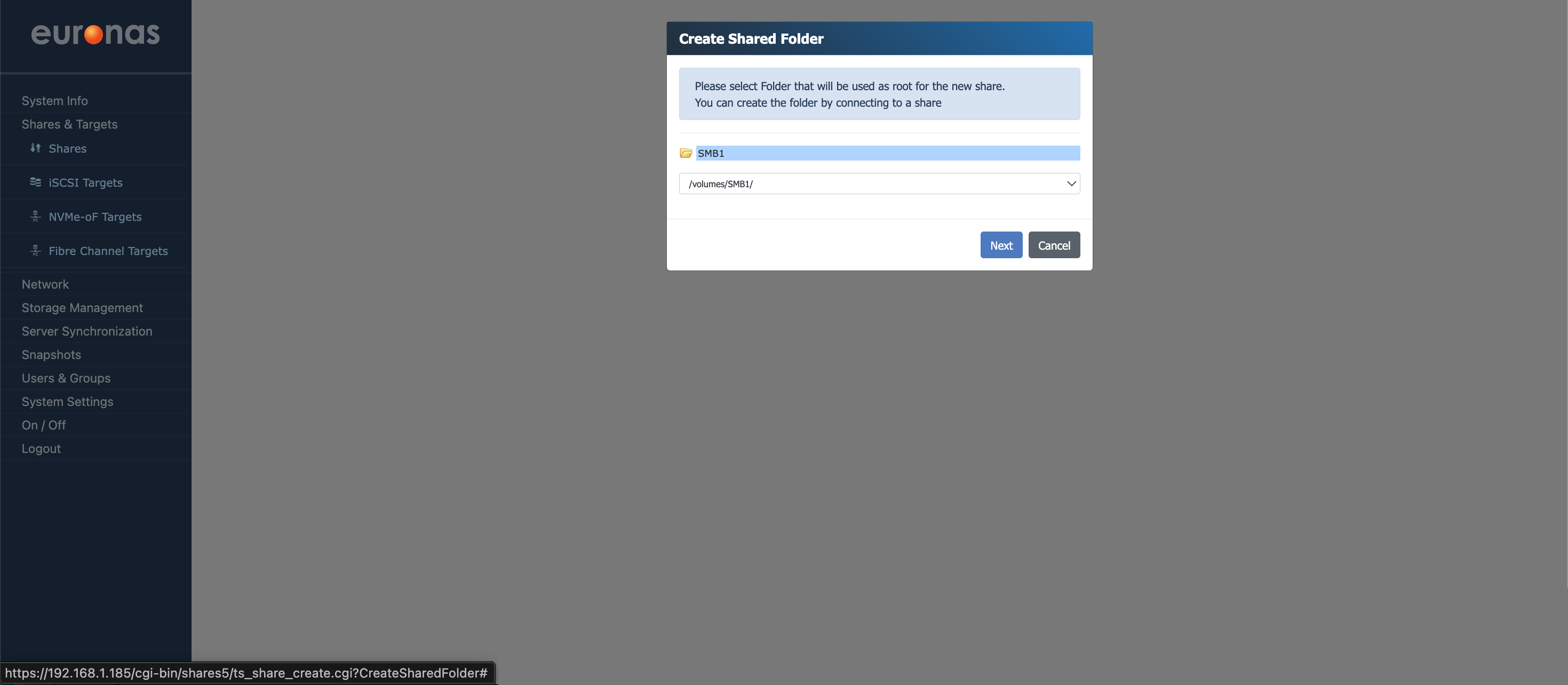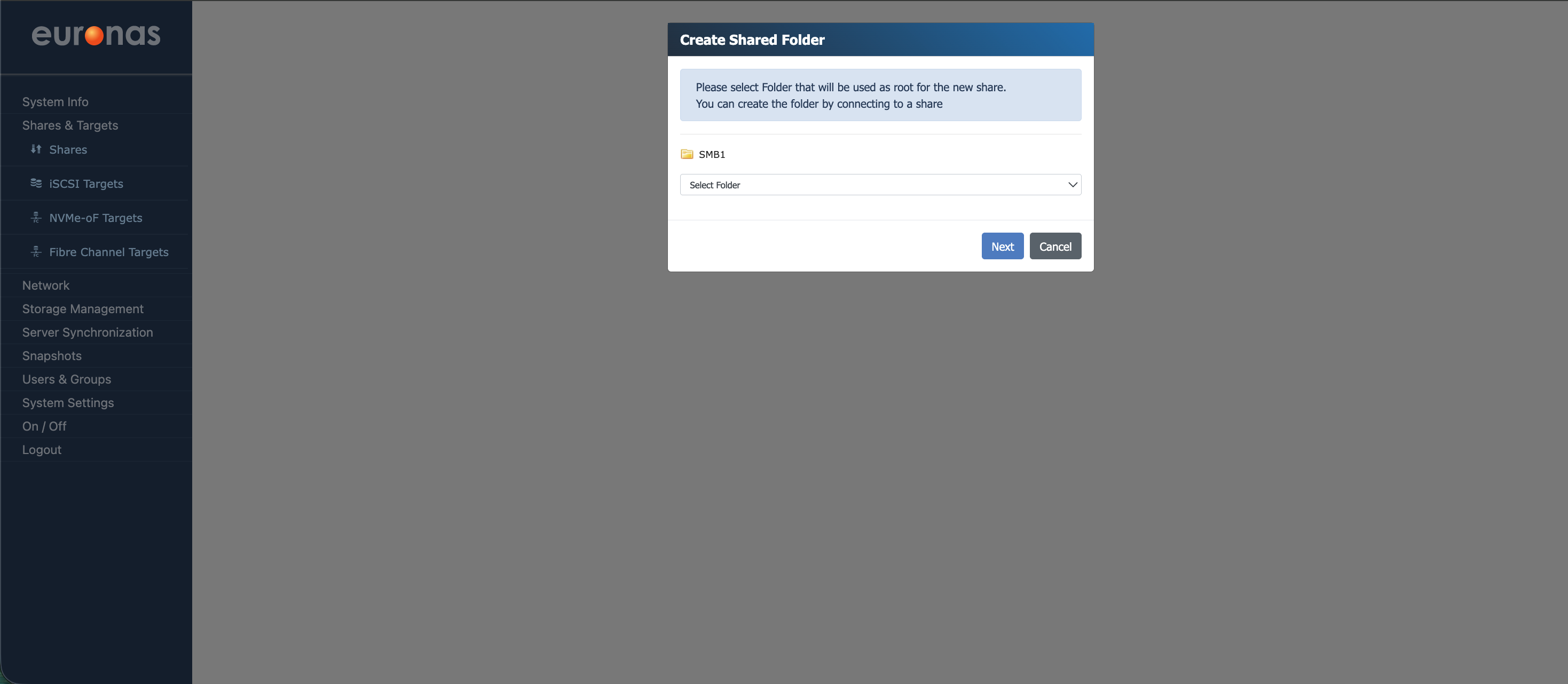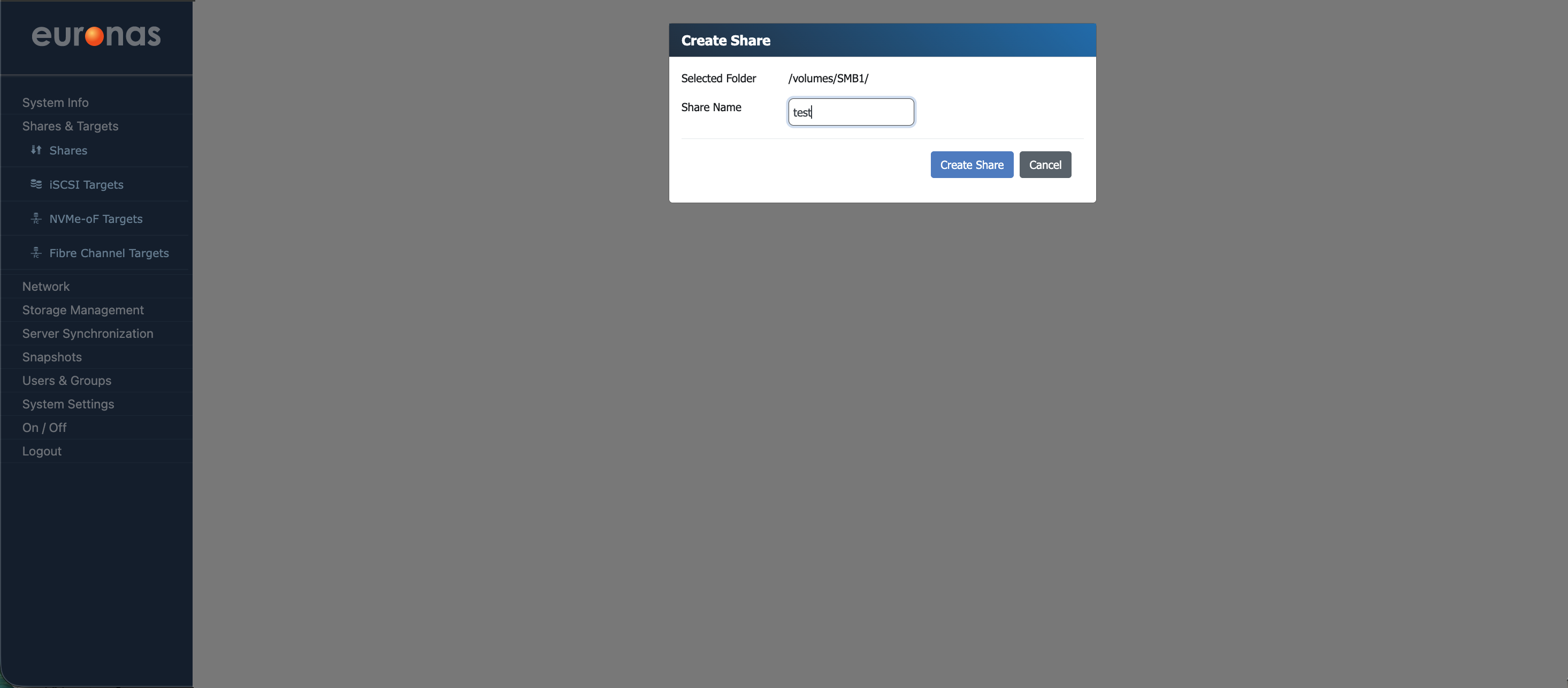 Additional subfolders can be created within the share by selecting the + Create Shared Folder button. Select this option to continue.