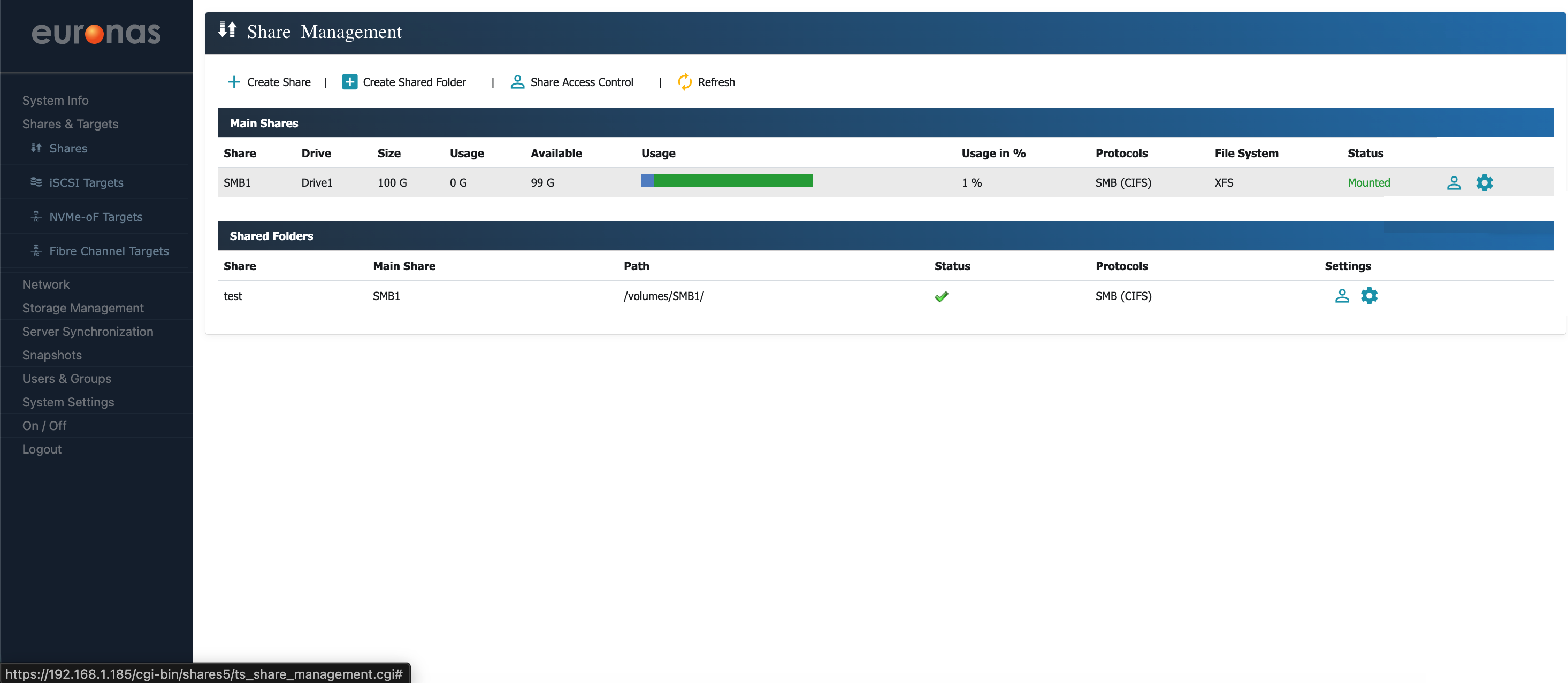 As shown, the SMB share has now been successfully created and is available for use. The main share (SMB1) is visible along with the subfolder share (test), confirming that both have been configured correctly.