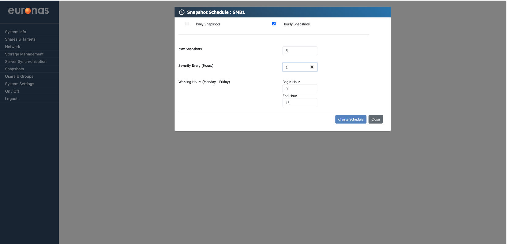 In this example, an hourly snapshot schedule has been configured. The system creates a rolling set of five snapshots, taken every hour between 09:00 and 18:00.