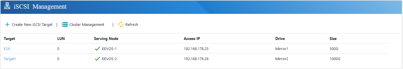 With HA Cluster you can create highly available iSCSI Targets. Should one node fail, the other will automatically take over its Targets and ensure business continuity.