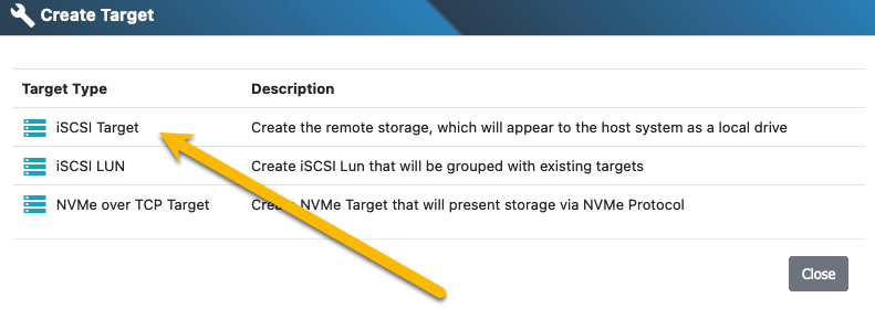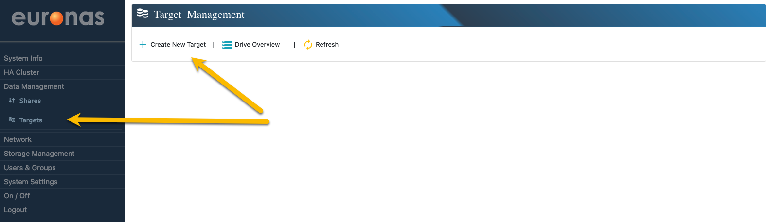 To create an iSCSI Target go to “Data Management” – “iSCSI Targets” and click on “Create New iSCSI Target”