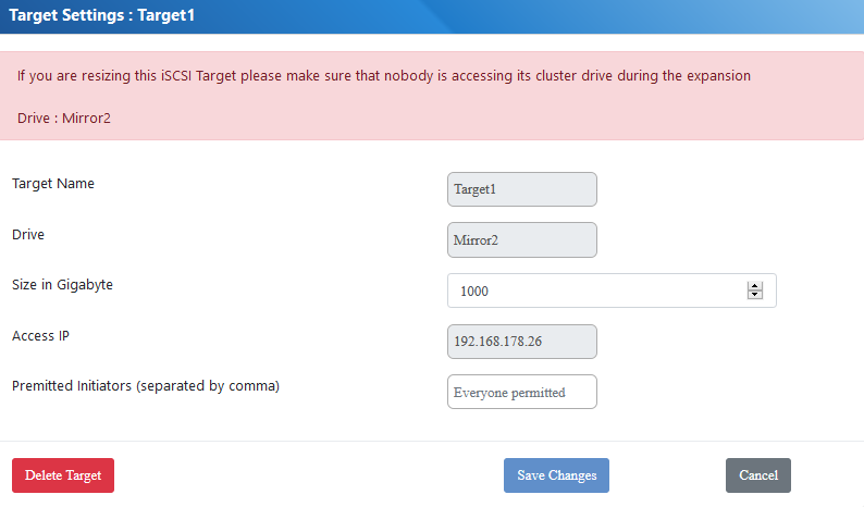 If you click on the target, the properties of the target will be shown. There you can expand the iSCSI target or define which IP address or network is permitted for access.