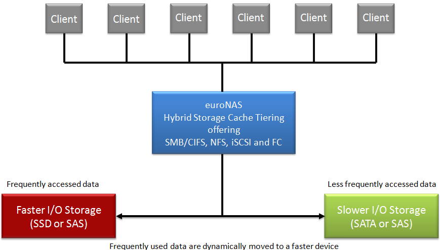 euroNAS analyses automatically incoming data transfer and moves blocks that are used more often to the faster (SSD) disks. The longer the server is in use the more efficient your server will become.