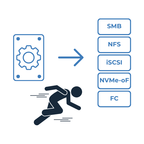 • SMB / CIFS, NFS, AFP, iSCSI, NVMe-oF, Fibre Channel